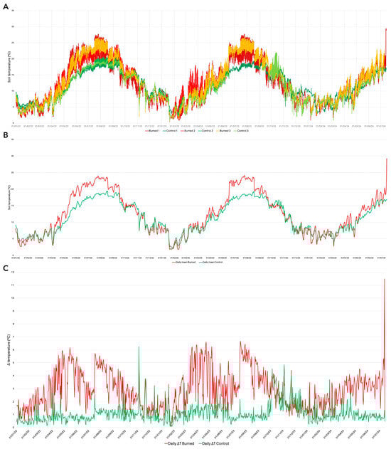 (A) Daily values of soil temperature, divided into months of the years 2022, 2023, and 2024, in burned and control areas; (B) mean daily values of soil temperature, divided into months of the years 2022, 2023, and 2024, in burned and control areas; and (C) daily soil ΔT values, divided into months of the years 2022, 2023, and 2024, in burned and control areas.