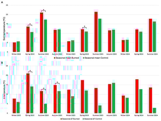 (A) Mean seasonal values of soil temperature for the years 2022, 2023, and 2024 in burned and control areas, and (B) seasonal soil ΔT values for the years 2022, 2023, and 2024 in burned and control areas. Statistically significant values are represented by asterisks: * = p < 0.05.