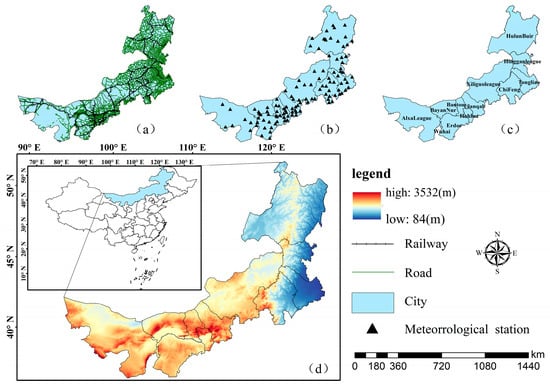 The Inner Mongolia Autonomous Region is geographically located between 97°10′ and 126°29′ E and 37°20′ and 53°20′ N (see Figure 1). Stretching diagonally from northeast to southwest, it forms a narrow, elongated shape. Its east–west length is approximately 2400 km, and its maximum north–south span is about 1700 km. The region’s land border is approximately 4200 km long, and its altitude is between 900 and 1300 m above sea level. The annual average temperature is 5.1 °C, and annual precipitation ranges from 50 to 450 mm. The precipitation distribution is uneven across seasons: spring is warm and dry, summer is hot and rainy, and autumn and winter experience less rainfall []. Fire prevention periods in Inner Mongolia vary by region. In the eastern region (areas east of the Xilin Gol League), the spring fire prevention period lasts from 15 March to 15 June, while the autumn fire prevention period extends from 15 June to 15 September. In the central and western regions (areas west of Ulanqab City), the fire prevention period runs from 15 September to 15 June of the following year. The total grassland area in Inner Mongolia is 867,000 km2, of which 680,000 km2 are usable grazing lands, accounting for one-fourth of the total grassland area in China []. This makes Inner Mongolia a critical region for the conservation of grassland resources in the country. There are 120 meteorological stations distributed across the region (see Figure 1b). The transportation network, including highways and railways, is shown in (see Figure 1a).