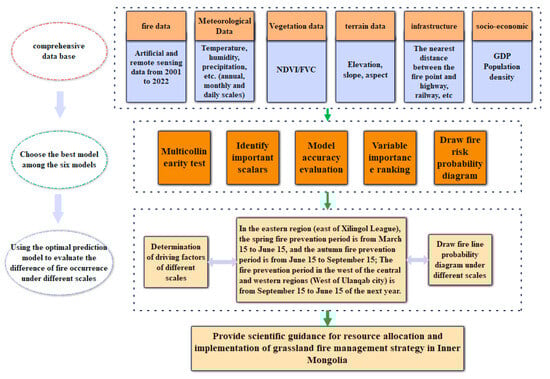 We analyzed the probability and driving factors of grassland fire occurrences in different regions and fire prevention periods of Inner Mongolia from 2001 to 2022 using manually recorded data and satellite remote sensing data. The analysis incorporated various factors, including meteorological, vegetation, topographical, human infrastructure, and socio-economic factors, and employed six models. The predictive accuracy, goodness-of-fit, and differences in driving factors were compared across the six models at different scales. The main findings are as follows: