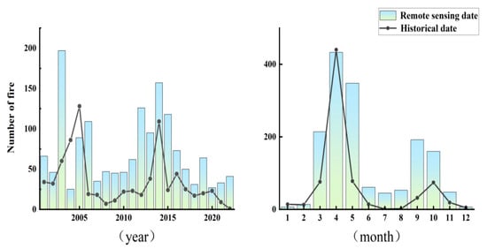 Annual and monthly occurrences of forest fires in Inner Mongolia Autonomous Region from 2001 to 2022.
