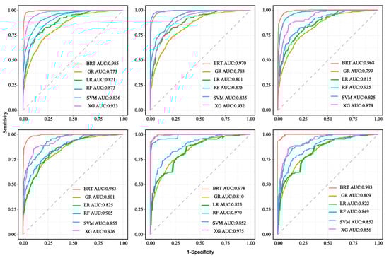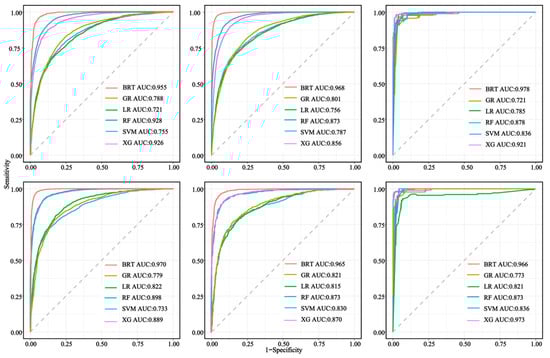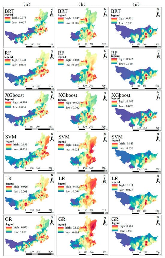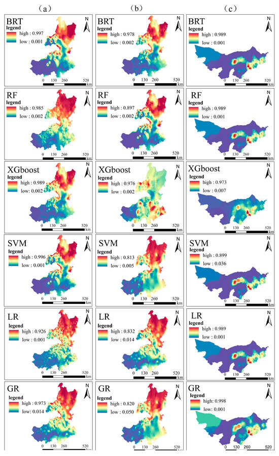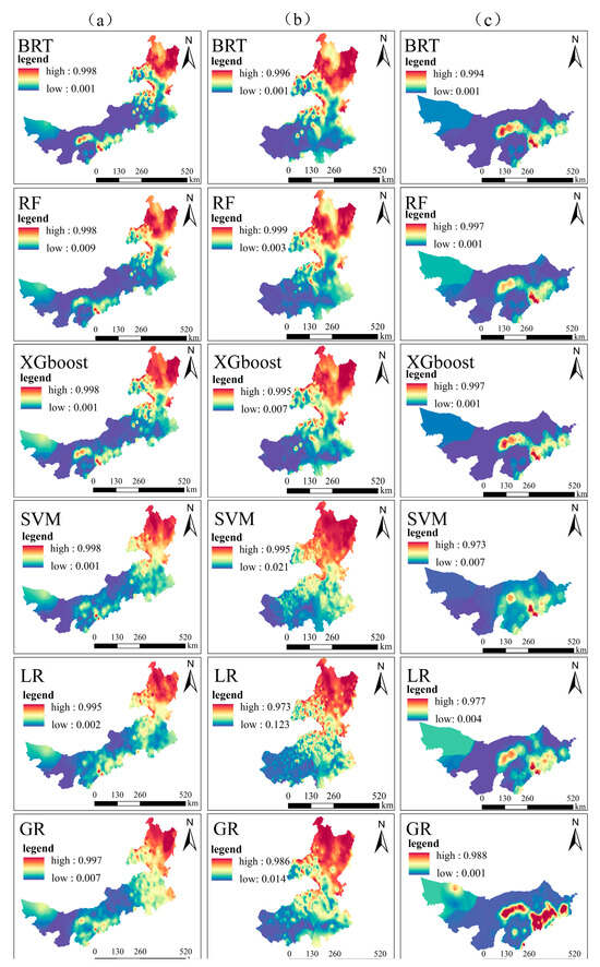 The ROC curve provides a straightforward and intuitive method for evaluating model performance based on AUC values. The prediction accuracy of six models was calculated for different regions and their respective fire prevention periods (see Table 2). These models’ modeling accuracy and fitting results were assessed and analyzed using the AUC values derived from the ROC curves (see Figure 4). For the six models tested across different regions and fire prevention periods using the two datasets, all AUC values exceeded 0.75, indicating good fitting performance across the board. The BRT, RF, and SVM models at the regional scale demonstrated higher prediction accuracy and AUC values than the other three models (LRGR, XGBoost), with AUc values exceeding 0.90. The BRT and XGBoost models achieved the highest prediction accuracy and AUC values among the six models, with both models reaching AUC values above 0.95. Similarly, for datasets considering both regions and fire prevention periods, the BRT, XGBoost, and SVM models outperformed the other three models (LR, GR, and RF), with AUC values exceeding 0.90. These findings indicate that the six grassland fire prediction models constructed for different regions and fire prevention periods exhibit good fitting performance and high prediction accuracy. The models meet the requirements for grassland fire prediction and modeling.