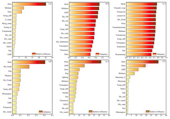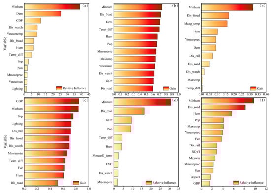Importance ranking of driving factors affecting grassland fire occurrence based on satellite remote sensing data. (a) Entire Region—BRT. (b) Eastern Region—XGBoost. (c) Central and Western Regions—SVM. (d) Eastern Region Spring Fire Prevention Period—XGBoost. (e) Eastern Region Autumn Fire Prevention Period—BRT. (f) Central and Western Region Fire Prevention Period—BRT.