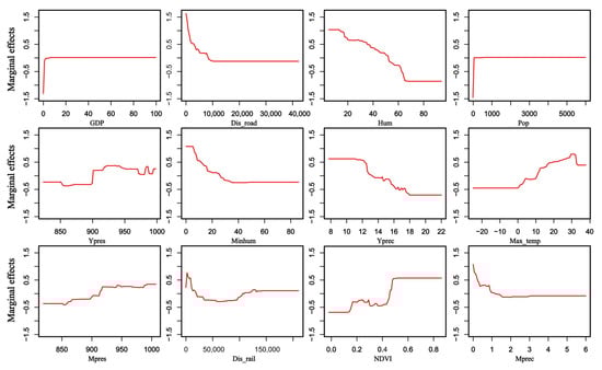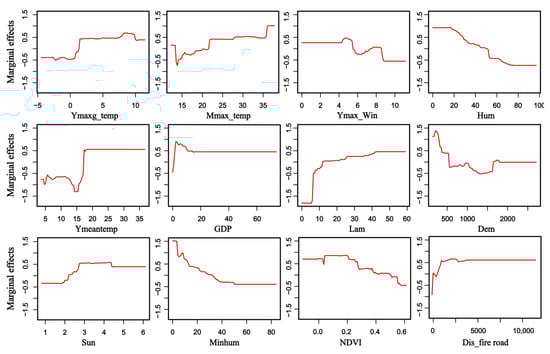We analyze the influence range of the selected variables on fire occurrence probability using the gbm.plot function in R to generate marginal effect plots. These plots illustrate the relationship between the probability of fire occurrence and the significant driving factors of grassland fires. The curve, with fire occurrence probability as the dependent variable and grassland fire-driving factors as independent variables, is referred to as the marginal effect curve. This curve intuitively demonstrates the nonlinear impact of independent variables on the dependent variable. When the marginal effect curve increases, it indicates that as the value of the independent variable rises, the predicted value of the dependent variable also increases. Conversely, a decreasing curve suggests that the dependent variable’s predicted value decreases as the independent variable’s value increases [] (Figure 2).