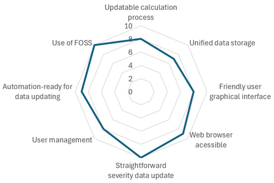 Taking into account the objectives of the platform, the design and specification of the logical and technological architecture were guided by the following characteristics and requirements: (i) implement a procedure to streamline the calculation of burn severity of burned areas that can be easily configured to accommodate changes in the data sources or calculated severity indicators; (ii) include data organization routines that enable the storage, structuring and access to both alphanumeric and geographical severity data within a unified system; (iii) provide a simple and user-friendly graphical interface that allows users to easily navigate the portal to consult the available information, filter data based on their requirements and visualize severity values on a geographical interface; (iv) be easily accessible through a web browser without requiring the installation of additional software; (v) provide a straightforward procedure for uploading new information as new wildfire occurrence data and satellite images become available, followed by the calculation of new severity indicators/products, enabling regular updates; (vi) manage user profiles and user access privileges; (vii) implement a software architecture that will allow the implementation of a complete automation of the updating process of severity data in a future version; and (vii) use of free and open source software (FOSS) in order to create a solution with reduced development and maintenance costs, while ensuring a platform with a robust, scalable and secure architecture. Figure 1 illustrates and summarizes the relative importance of each identified requirement, with higher values indicating greater relevance in the platform’s design and implementation.
