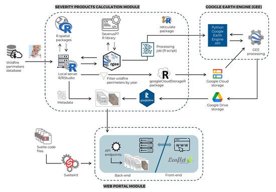 Considering the platform’s requirements, the architecture was structured as two main interconnected modules: (i) a module for calculating burn severity products, which is responsible for producing standardized satellite-derived datasets on observed/historical severity in burned areas for mainland Portugal; and (ii) the web portal module, which facilitates the sharing of the generated data by the previous module (Figure 2).