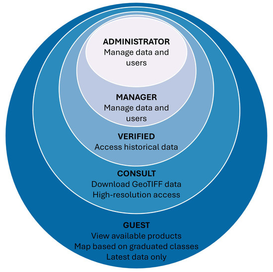 The access to the portal’s functionalities is structured according to five distinct user profiles structured hierarchically, with each profile accumulating the access permissions of the preceding levels (Figure 5). The defined profiles and associated permissions are as follows: