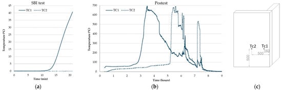 Temperature measurement within the wood fiber insulation using internal thermocouples. Measurements were recorded during the fire tests and after SBI tests. During the test, the maximum temperature reached could be identified, and after the test, the smoldering phenomenon curve could be recorded. For that purpose, two thermocouples located at a 500 mm height and mid-depth of wood fiber insulation were used in the SBI test: TC1 located in the corner and TC2 located at 500 mm from the corner. In this regard, temperatures registered during the test and in the following hours were monitored to identify temperature peaks related to the combustion process of the wood fiber insulation until the total combustion of the insulation happened (ambient temperatures again recorded). During the intermediate-scale fire test, the distribution of thermocouples throughout the sample at the mid-depth of each system layer enabled us to identify any possible combustion processes of the wood fiber insulation.