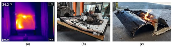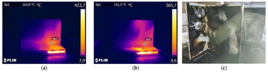 Figure 17c,d), but in the second, smoldering was stopped by the mineral wool sandwich panel once all the insulation of the first panel was consumed (