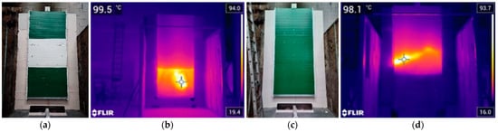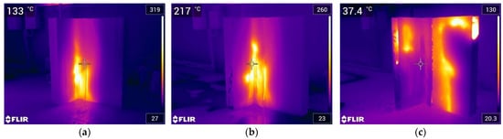 Visual evaluation of the distribution of temperatures using a thermographic camera. Thermographic images were recorded after the SBI and fire propagation tests at the intermediate scale to identify a possible self-sustained smolder propagation process, evaluate its spread along the system, and conclude its limitation or extinction. Additionally, thermographic images were also used during fire resistance tests to evaluate the horizontal heat transfer between system elements.