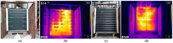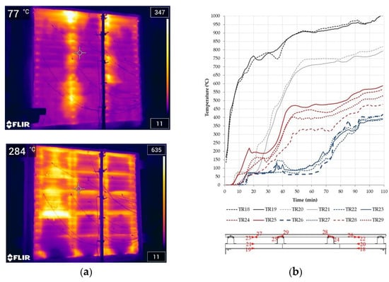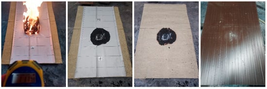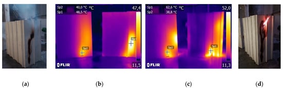 Figure 17a). In this regard, although the test results and recorded temperatures were similar, there were differences in the smoldering propagation since the panel composed of non-combustible material made it possible to stop the self-sustaining process. In the case of the first sandwich panel façade (system 1, fully made of wood fiber insulation), the fire reached the second panel (