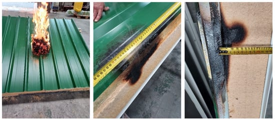 Figure 7). This means that the pass or fail condition could depend on the system configuration and the mounting conditions; hence, deformation or damage during the service life could lead to failure because of fire penetration and the smoldering of the wood fiber insulation. Accordingly, several parameters could affect a roof system’s behavior when exposed to external fire: