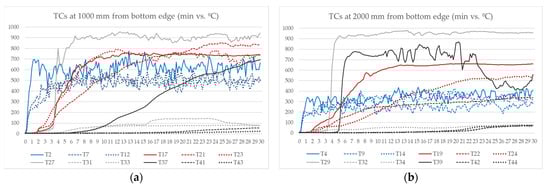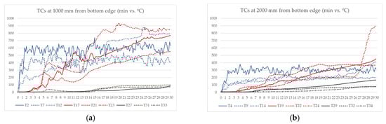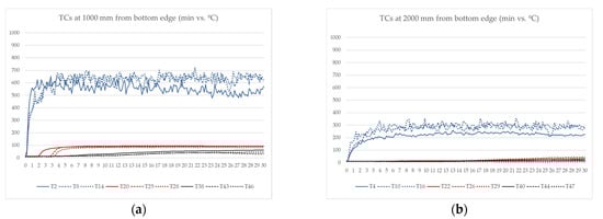 Figure 12). While the external cladding temperatures were 400–700 °C at one meter high and 200–300 °C at two meters high for both profile façade systems and sandwich panels, the internal temperatures differed from one system to other. The maximum temperatures in the wood fiber insulation of the sandwich panels were around 100 °C. Meanwhile, internal thermocouples in the air cavities, omega profiles and even the internal insulation layer of the profile façades (continuous black in