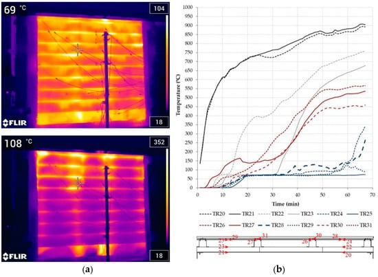 Figure 2), an increase in the temperature that started at minute 12 was only registered by TC1 during the fire test (21 min exposition time). After the test, the sample was turned upside down and temperatures reached 700 °C, which was related to the combustion process of the wood fiber insulation. Two and a half hours were measured between the recorded peaks, the time it took to travel the 350 mm distance between the thermocouples. The combustion of the insulation in this area was completed after 8 h when ambient temperatures were recorded again.