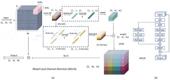 Figure 2a, the input features of MLCA undergo a two-stage pooling process. During the initial phase, local spatial details are gathered through local average pooling, resulting in a feature map with dimensions