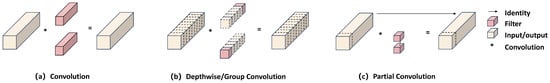 Figure 4c) gathers spatial features by applying filters to a selection of input channels, with the remaining channels remaining unaffected. This method can considerably decrease computational expense and memory usage without a substantial loss in performance, and it facilitates the trade-off between efficiency and effectiveness by choosing a suitable portion ratio.