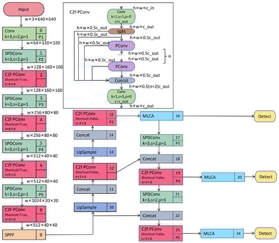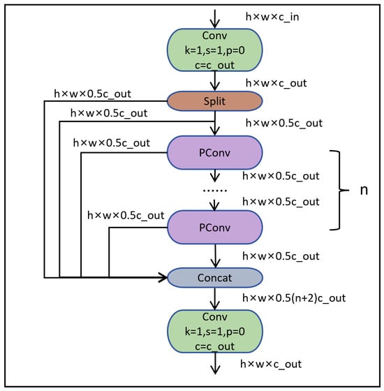 33]. C2f-PConv employs PConv technology to decrease unnecessary computation and memory usage, while maintaining feature extraction proficiency, thus lowering the model’s computational complexity and parameter count.