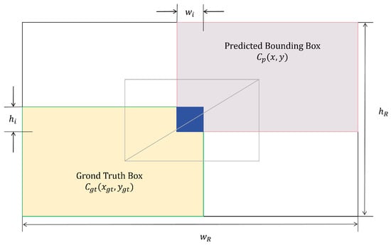 The boundary box loss based on represents the loss using IoU, IoU is calculated as the quotient of the overlap area to the combined area of the predicted and actual bounding boxes. is the area of their union. When both and are zero, this can cause vanishing gradients during backpropagation. For the predicted bounding boxes, x and y represent the center coordinates, while and refer to the center coordinates of the ground truth bounding box. and are the width and height of the ground truth box, respectively. is the weighted intersection parallel ratio loss, and is the weight factor for this loss.