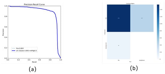 Regarding the validation phase, we allocated the 3253 forest fire images among a training set, a testing set, and a validation set, adhering to an 8:1:1 division. The outcomes of our experiments indicate that our model achieved a precision of 87.5%, a recall of 87.5%, and an mAP@0.5 of 89.3% on the FLAME dataset. These metrics represent improvements of 2.17%, 5.5%, and 1.9% over the baseline YOLOv8 model. Concurrently, the model’s parameter count was decreased by 43.8%, and the GFLOPs were lowered by 36.7%, which streamlines more effective deployment on mobile devices.