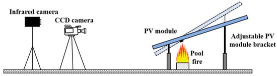 The experiment utilized a steel fuel pool with a diameter of 35 cm and a sidewall height of 15 cm, positioned 30 cm directly beneath the junction box of the PV module. The fuel used in the experiments was gasoline (92 octane), with an initial fuel mass of 2.5 kg. Prior to formal experiments, the steady-state combustion rate of the fuel measured using a balance was 2.65 g/s. A CCD camera was used to capture and record the combustion and burn damage process of the PV modules under the pool fire. An infrared camera (measuring range: 0–1200 °C, accuracy: 0.1 °C, frequency: 50 Hz) was employed to capture and record the dynamic surface temperature distribution of the PV modules during the experiments.