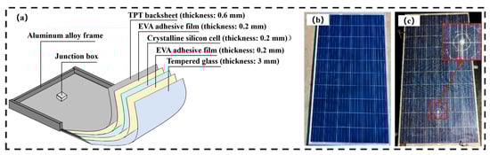 (a) Schematic diagram of the PV module structure; (b) Intact PV module; (c) Cracked PV module and partial magnified section.