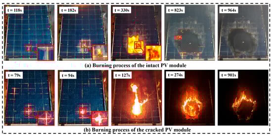 Figure 3 presents some typical images of the burning process at different times, and the experiments of intact and cracked PV modules with a 45° inclination angle (Test No.4 and No.9) are selected as examples.