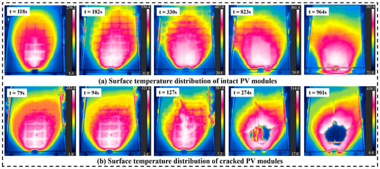 In order to further illustrate the burning characteristics of intact and cracked PV modules under the influence of the pool fire, Figure 4 presents the surface temperature distribution of PV modules in the experiments with a 45° inclination angle (Test No.4 and No.9). As illustrated in the figure, the surface temperature distribution of the PV modules can be roughly divided into three regions: high-temperature region, medium-temperature region, and sustained low-temperature region. Figure 4a presents the surface temperature distribution patterns of intact PV modules at different times. It shows that after exposure to the pool fire, the front surface of the intact PV module experienced a rapid temperature rise, with temperatures in the gaps between crystalline silicon cells being significantly higher than those in the covered regions, resulting in the grid-like maximum temperature distribution. As the pool fire continued to burn, the overall temperature of the front surface of the PV module gradually increased, the high-temperature region expanded continuously, and the temperature in areas where the crystalline silicon cells had detached was significantly higher than in areas where they remained intact. Eventually, as the pool fire diminished and extinguished, the surface temperature of the PV module gradually decreased, and the high-temperature region contracted.