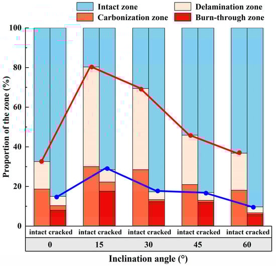 As depicted in Figure 6, the burning damage extent on the front side of both intact and cracked PV modules demonstrated a trend of initially increasing and subsequently decreasing as the inclination angle increased from 0° to 60°. For intact PV modules, at an inclination angle of 0°, the intact zone was the largest at 10,965.2 cm2, and the burning damage extent was only 32.6%. This was mainly because the PV module influenced the air entrainment and flame shape of the pool fire, limiting the flame contact area with the PV module [15]. When the inclination angle increased to 15°, the delamination and carbonization zones expanded to 8174.3 cm2 and 4887.9 cm2, respectively, increasing by 5912.5 cm2 and 1846.1 cm2 compared to the 0° condition. The burning damage extent also increased to 80.3%, reaching the maximum burning damage extent of the front side observed in the experiments. This was primarily because, as the inclination angle initially increased, the PV module obstruction of air entrainment into the pool fire decreased, allowing the fire plume to scorch a larger area of the PV module [16]. Consequently, the overall temperature and temperature rise rate of the PV module increased. As the inclination angle gradually increased to 60°, the lateral width and vertical thickness of the fire plume in contact with the PV module decreased [17], causing heat transfer to become more diffuse. The areas of the delamination and carbonization zones decreased to 3041.6 cm2 and 2945.3 cm2, respectively, and the burning damage extent reduced to 36.8%.