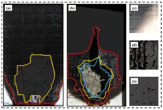 (a) Schematic diagram of the back side regional classification of an intact PV module; (b) Schematic diagram of the back side regional classification of a cracked PV module; (c) Enlarged view of the undamaged backsheet zone; (d) Enlarged view of the burnt TPT zone; (e) Enlarged view of the cell detachment zone.