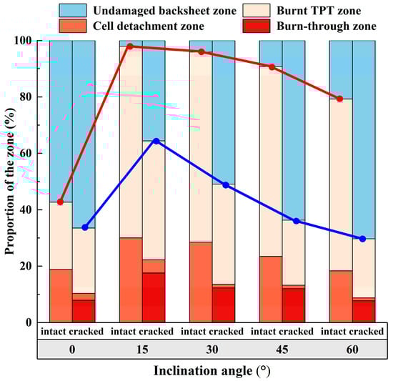 Figure 8 illustrates that as the inclination angle of the PV modules increased from 0° to 60°, the burning damage extent on the back side of both intact and cracked PV modules exhibited a trend of initially increasing and subsequently decreasing, consistent with the damage observed on the front side. At an inclination angle of 0°, the undamaged backsheet zone measured 9321.6 cm2 for intact PV modules and 10,817.1 cm2 for cracked PV modules. The burning damage on the back side of intact PV modules was 1495.5 cm2 larger than that of cracked PV modules. This discrepancy is primarily due to the obstruction of intact PV modules, which caused the flame to deflect [18]. In contrast, after the cracked PV modules were burned through by the pool fire, the flames passed directly through the modules, ceasing to burn along the backsheet. As the inclination angle increased, the difference in burning damage extent between intact and cracked PV modules became more pronounced. At an inclination angle of 15°, both intact and cracked PV modules exhibited a peak burning damage extent of 97.9% and 64.4%, respectively. Concurrently, the areas of all partitioned zones (excluding the undamaged backsheet zone) reached their maximum values under the inclination angle.