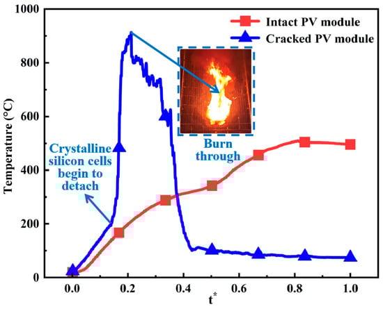 In order to analyze the surface temperature distribution of PV modules, an infrared camera was used to monitor the module surface, and temperature data from the central region during the burning process were recorded. To better illustrate the temperature rise patterns of intact and cracked PV modules, Figure 9 presents the temperature variation curves at the central surface location of intact and cracked PV modules with a 45° inclination angle. The ignition moment of the pool fire is marked as t = 0, and a dimensionless time parameter, t* = t/tmax, is used to measure the fire duration of the PV modules, where t represents the pool fire burning time, and tmax is the time when the pool fire extinguished under the given condition.