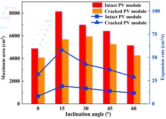 As presented in Figure 10, both the maximum area and the expansion rate of the high-temperature region for intact and cracked PV modules demonstrated a trend of initially increasing and subsequently decreasing as the inclination angle increased. The maximum area of the high-temperature region for intact PV modules was consistently larger than that of cracked PV modules, whereas the expansion rate was consistently higher for cracked PV modules than for intact ones. This was primarily because the burning process of cracked PV modules is faster than that of intact PV modules. The temperature rise rate is higher, and after being rapidly burned through by the pool fire, the stable combustion flame generated by the PV module itself at the edges of the burn-through zone and the thermal radiation from the pool fire were insufficient to cause a sustained expansion of the high-temperature area. In contrast, intact PV modules were not burned through by the pool fire, allowing for a more thorough heating.