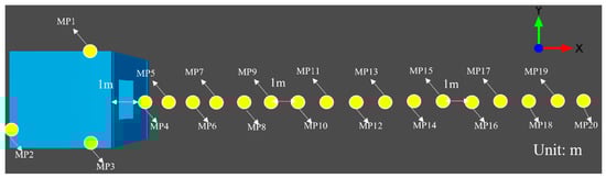 Figure 1 presents a cubic container measuring 3 m × 3 m × 3 m with 0.2 m thick walls. A 1.5 m × 1.2 m opening is designed along the positive X-axis direction, with its center positioned 1 m below the container’s top surface. A total of 20 monitoring points are deployed for comprehensive surveillance, including three internal points: MP1 (2.5, 3, 2), MP2 (0, 0.75, 0.5), and MP3 (2.6, 0, 2). Points MP4–MP20 are equally spaced at 1 m intervals along the horizontal plane coinciding with the opening’s center height. To simulate far-field explosive wave propagation, a plane-wave boundary condition (PLANE-WAVE) is applied along the positive X-axis direction, while Euler boundaries (EULER) are implemented in other directions to accommodate explosion simulation requirements.