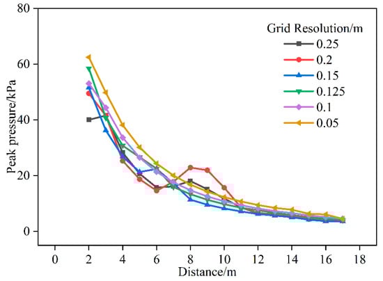 Figure 2 investigates six grid resolutions (0.25–0.05 m) and their impact on combustion pressure peak curves. The results demonstrate significant resolution-dependent characteristics: high-resolution grids (≤0.125 m) reveal complex pressure fluctuations indicative of detailed combustion features, while coarser resolutions produce smoother curves potentially overlooking local phenomena. Notably, the 0.05 m resolution exhibits overestimated combustion velocity, suggesting excessive precision may introduce numerical artifacts.