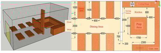 Figure 3 demonstrates a representative street-front restaurant model strategically partitioned into two primary functional zones: dining and kitchen areas. The dining section incorporates six optimally arranged tables to replicate real-world spatial efficiency and operational practicality. The kitchen integrates essential culinary infrastructure including cooking ranges, food preparation stations, and service counters, fully capturing back-of-house operational workflows. The specific measurements are presented in Figure 3 and Table 1.