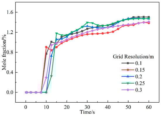Through systematic evaluation of H-BNG molar fractions across mesh resolutions (0.1–0.3 m), Figure 4 demonstrates strong convergence among 0.1 m, 0.2 m, and 0.25 m configurations. Critical analysis of the 20–35 s timeframe reveals the 0.2 m resolution achieves <2% deviation from the 0.1 m benchmark, establishing this mid-range resolution as computationally optimal while maintaining physical fidelity.