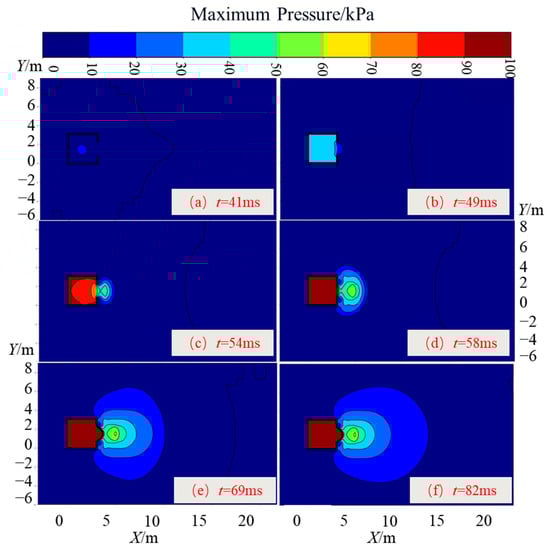Figure 5 illustrates the far-field pressure field evolution of premixed H-BNG (20% H2) combustion at the Z = 2 m cross-section. Following central ignition, pressure rapidly accumulates and propagates radially. At 41 ms, the central overpressure reaches 10 kPa. By 49 ms, the container experiences full-coverage overpressure of 30 kPa, with 10 kPa observed at the vent opening. The maximum positive pressure of 58.5 kPa occurs 2 m from the container at 58 ms, while internal overpressure exceeds 100 kPa. A peak internal pressure of 361.8 kPa is recorded at 69 ms. By 82 ms, the pressure field stabilizes with the 10 kPa overpressure region extending vertically from Y = 6 m to Y = −4 m, and horizontally to X = 13 m. The hazardous zone (>20 kPa overpressure) spans up to X = 9 m downstream, presenting significant injury hazards.