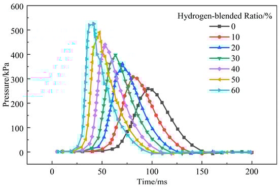 Internal pressure curves of the container at different hydrogen-blended ratios.