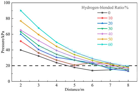 The external pressure curves shown in Figure 7 reveal that when the hydrogen-blended ratio reaches 30% or higher, the peak pressure increases significantly with the hydrogen-blended ratio, with the pressure drop following a “fast-then-slow” pattern. In contrast, when the hydrogen-blended ratio is 20% or lower, the pressure curve does not always decrease with distance; in some cases, it even increases. Notably, as the hydrogen-blended ratio rises, the distance at which the explosion can cause injury also increases, thereby raising the explosion’s hazard. Specifically, for hydrogen-blended ratios between 40% and 60%, the injury-causing distance ranges from 7 m to 8 m, while for ratios between 20% and 30%, it ranges from 6 m to 7 m. For pure methane, this distance is approximately 4.5 m.