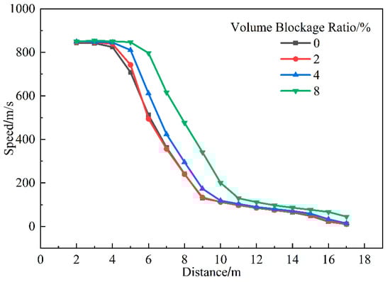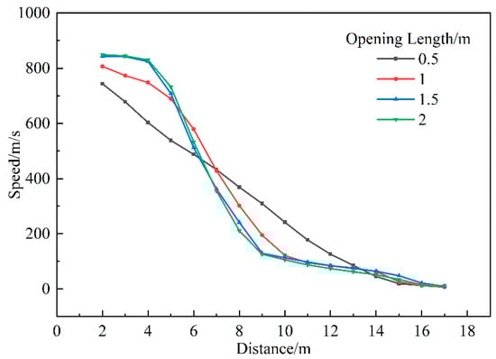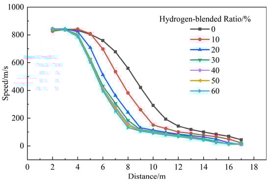 In the external flame velocity curves shown in Figure 8, the flame propagation speed exhibits three distinct stages as it moves away from the opening: “steady high speed”, “rapid decline”, and “gradual decline”. In the first stage, the flame speed stabilizes at around 840 m/s, regardless of the hydrogen-blended ratio. For low hydrogen-blended ratios (below 20%), this stage extends up to 4 m, while for high hydrogen-blended ratios (above 30%), it only extends up to 2 m. As the distance increases, the flame speed rapidly decreases in the second stage, followed by a slower reduction in the third stage. Although the flame speed trends are similar for different hydrogen-blended ratios, the specific values and rates of decline vary.