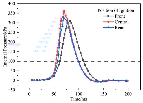 Different ignition positions significantly affect the deflagration characteristics of H-BNG within the container, as illustrated in Figure 9. When ignited at the front, the pressure peak occurs later (82.3 ms) and is the lowest (309.7 kPa). Central ignition produces the highest pressure peak (361.0 kPa), resulting in the most intense deflagration and the greatest risk. Rear ignition yields a slightly lower peak (327.7 kPa). Overpressure above 100 kPa can be fatal; the duration of overpressure above 100 kPa is shorter with front ignition, while it lasts approximately 41.2 ms for both central and rear ignitions. Due to its proximity to the opening, front ignition allows for some of the fuel to be expelled quickly, reducing the explosion’s hazard.