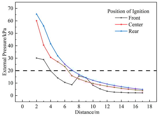 In the analysis of external pressure curves (Figure 10), front ignition results in a significant expulsion of fuel, leading to lower pressure peaks both inside and outside the container, with a peak of 30.1 kPa at 2 m. In contrast, rear ignition generates the highest external pressure peak, reaching 65.4 kPa at 2 m. Notably, front ignition shows a pressure rise at 8 m, likely due to unburned fuel mixing with air and reigniting. Regarding the human injury threshold (20 kPa), front ignition poses a risk within 4 m, while rear ignition extends the risk to 7 m. Although central ignition results in high internal pressure, rear ignition has a more significant impact during far-field propagation, with both ignition types posing similar injury risks at distances of 6–7 m. Rear ignition presents the highest far-field hazard, with the injury radius extending up to 7 m; front ignition, despite its initially lower impact, requires attention due to the pressure rise phenomenon.