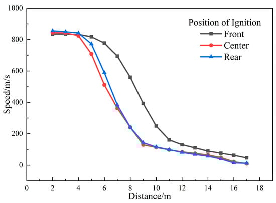 Figure 11 shows that in the analysis of internal pressure curves and flame velocity, front ignition is characterized by lower internal and external pressure peaks but an unusual flame propagation speed. In the external flame velocity curves, front ignition reaches 559.8 m/s at 8 m, significantly higher than the 241.7 m/s for central and rear ignitions. Especially within the first 4 m, the flame from front ignition propagates at a high speed of about 834 m/s before dropping sharply to 160.8 m/s and then gradually decreasing. The flame speed curves for central and rear ignitions are similar, with the flame initially propagating at high speed before gradually decreasing to 136 m/s. Although front ignition results in lower internal and external pressure peaks, its far-field flame propagation speed is the highest, indicating a potential hazard that should not be overlooked from the perspective of flame propagation.