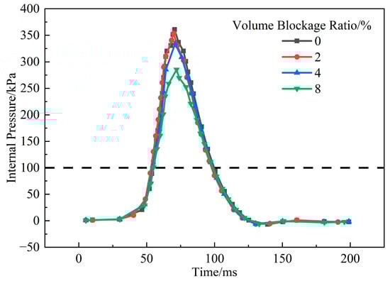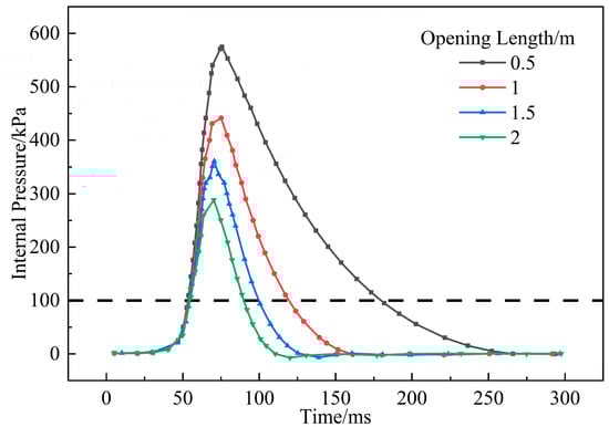 The internal pressure variation within the container is significantly affected by different opening sizes, as shown in Figure 12. As the opening size decreases, the space becomes increasingly confined, enhancing turbulence and compressibility during the explosion, leading to a gradual increase in peak internal pressure. The peak pressure reaches 570.7 kPa with a 0.5 m opening, significantly higher than the 288.5 kPa with a 2 m opening. While the opening size has little impact on the time to peak pressure, it significantly affects the duration of overpressure. The smaller the opening, the longer the duration of overpressure (≥100 kPa), with the 0.5 m opening lasting 127 ms compared to 33 ms for the 2 m opening. In confined spaces, as the opening size reduces (transitioning towards a sealed environment), both the peak internal pressure and the duration of lethal overpressure increase significantly, thereby substantially raising the risk of an incident.