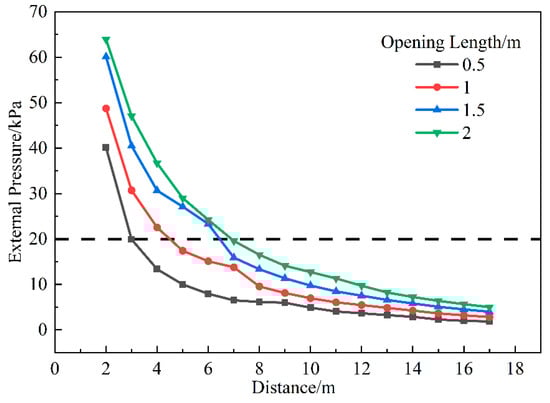 As shown in Figure 13, as the opening size decreases, the internal space of the container becomes more confined, leading to a gradual increase in the peak internal pressure during the explosion of H-BNG. Conversely, the peak external pressure decreases as the opening size reduces. Specifically, at a distance of 4 m, the peak external pressure with a 0.5 m opening is 13.4 kPa, while the 2 m opening reaches 36.7 kPa. The injury-causing distance (overpressure ≥20 kPa) for the 2 m opening is about 7 m, while it reduces to 3 m for the 0.5 m opening.