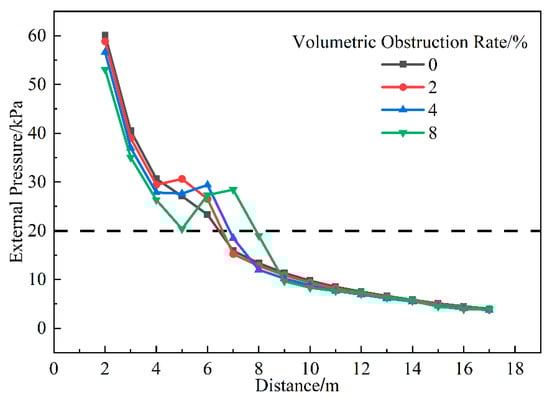 External pressure analysis shows injury-risk distances expanding from 4.5 m (pure methane) to 7–8 m (40–60% H2). Rear ignition produces the maximum external overpressure of 65.4 kPa at 2 m, corresponding to a 7 m hazard range. Vent size paradoxically modulates external pressures: 2 m openings yield the highest external overpressure (36.7 kPa); while 2–4% blockages induce localized pressure recovery between 4 and 9 m.