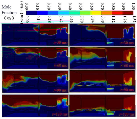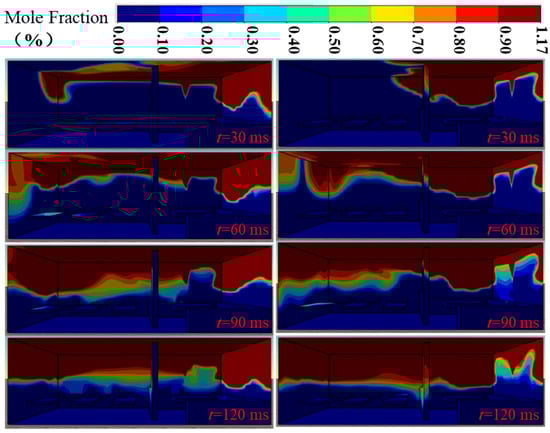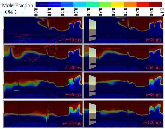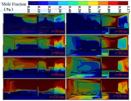 Figure 25 illustrates the spatiotemporal evolution of mole fractions of 20% H-BNG under different door states in the restaurant. In the initial stage (30 s), the gas leak spreads along the wall toward the front door, with no significant impact on the mole fraction distribution whether the door is open or closed. At 60 s, the open door allows the mixed gas to diffuse freely outside, but the initial difference is minimal. As time progresses (90 to 120 s), the gas concentration in the dining area significantly decreases with the door open, reducing the coverage area, while the kitchen area, being farther from the front door, shows no significant change in mole fraction distribution regardless of the door state. Data from the monitoring points in Figure 26 further confirm that the mole fraction of H-BNG in the kitchen remains stable and unaffected by the door state, aligning with the distribution analysis and indicating the localized diffusion of leaked gas within the restaurant and the front door’s regulatory effect on gas distribution within the restaurant layout.