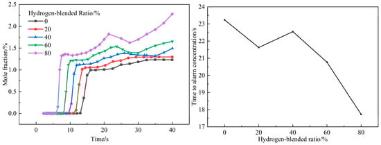 For 80% H2 leaks along the +Z direction, alarm concentration (0.8 m height) is reached within 120 s, with faster dispersion compared to low-H2 blends. Sensor response times vary spatially (21.6 s proximal vs. 40.2 s distal). −Y-axis leakage achieves broader coverage; while +Z-axis leakage concentrates higher molar fractions in ceiling regions.