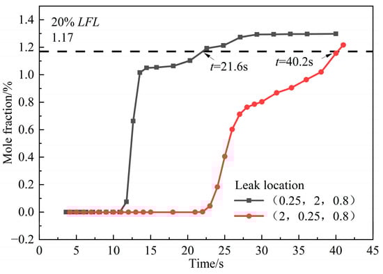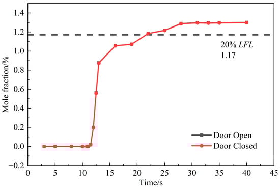 This section explores the spatiotemporal distribution of mole fractions of 20% H-BNG leaking from (0.25, 2, 0.8) in the +Z direction, analyzing the response of combustible gas alarms with the exhaust fan turned off under conditions of an open or closed front door.