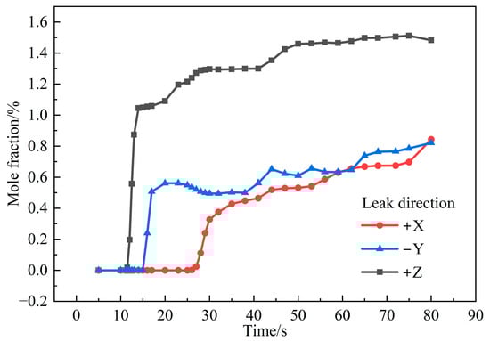 Figure 24 compares the changes in mole fractions at monitoring points during leaks in different directions for 20% H-BNG. In each direction, the mole fraction increases rapidly initially, then slows down. The gas in the +Z direction diffuses quickly, with the earliest inflection point at 11.5 s, due to its rapid spread along the wall; the +X direction shows the slowest diffusion, with the latest inflection point at 26.0 s due to multiple collisions with obstacles. In the +Z direction, the alarm triggers at 21.6 s, indicating rapid gas accumulation; however, in the −Y and +X directions, the concentration remains low (around 0.8%) even at 80 s, without triggering the alarm. With a constant leak volume, the +Z direction triggers the alarm quickly, aiding timely intervention and reducing accumulation risk. In contrast, the −Y and +X directions may lead to gas accumulation at distant points, increasing the risk of combustion and explosion, with delayed alarms making effective prevention and control more difficult.